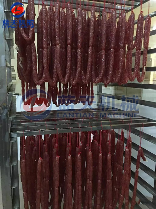 2、減速干燥階段。發色期和收縮定型期的控制,溫度控制在52℃~54℃,濕度控制在45%左右、時間為3到4個小時,臘腸逐漸從淺紅色轉為鮮紅色,腸衣開始收縮,這時一定要注意硬殼的出現,可以進行冷熱交替使用,效果更好。
