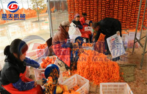 柿餅加工工藝流程:選果→去皮→裝盤→第一次烘烤→???rarr;第二次烘烤→停烤→第三次烘烤→???rarr;真空包裝→入庫。