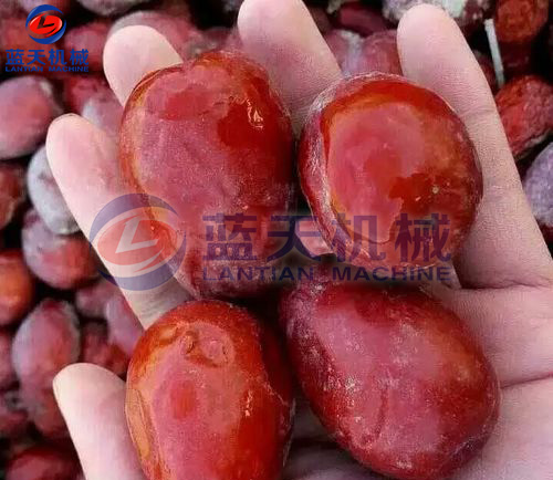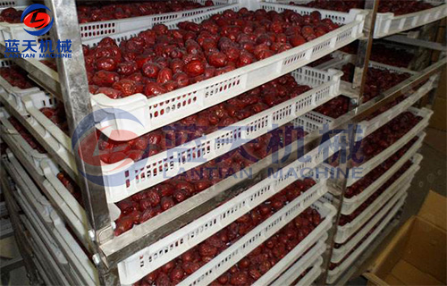 3、烘干工藝:先在熱水中瀝干棗表面的糖漿,然后裝入物料盤(pán),將物料盤(pán)物料車(chē),推入烘干房,使含水量降至15%左右,烘干溫度開(kāi)始為50℃,過(guò)6-7小時(shí)升至70-80℃等棗皮發(fā)皺即可,用手摸感到外硬內(nèi)軟時(shí)取出包裝。