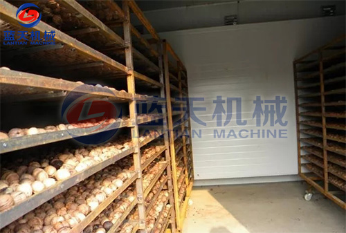 脫青皮后8小時內入倉上架排濕烘烤,排濕溫度35-40℃,烘烤時間12-15小時,果殼表面水分散失,顏色由黑褐轉為褐色時排濕結束。