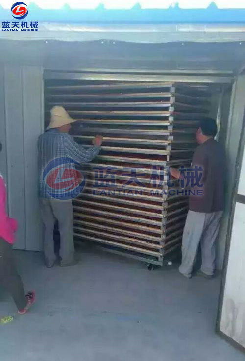 鮮果由于果內(nèi)的水分外滲,皮層聚集充分的非結(jié)合水分,這是因?yàn)楸砻娴乃魵鈮号c溫度氣壓基本相同,壓迫果實(shí)內(nèi)部水分很快移向表面以滿足表皮水分汽化的需要。果實(shí)內(nèi)失水率達(dá)到近50%時(shí),室內(nèi)溫度自然上升到50℃-55℃,循環(huán)風(fēng)速可有所下調(diào),果內(nèi)含水越少,脫水時(shí)間越短。此期歷時(shí)12小時(shí)左右。大量地脫水使果實(shí)體形縮小,即平常說的呈半干狀態(tài),此期稱重測(cè)水,果實(shí)內(nèi)含水30%左右。