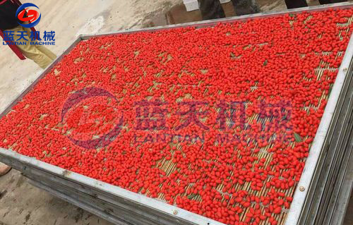 枸杞鮮果干燥的普遍現(xiàn)象是果實(shí)表面水分?jǐn)U散大于內(nèi)部擴(kuò)散速率,果內(nèi)含游離水外滲速率大于結(jié)構(gòu)水外滲速率,這是枸杞鮮果內(nèi)含糖分高導(dǎo)致脫水干燥困難的緣故。如果干燥室內(nèi)溫度過高,鮮果表面水分散失過快,而果內(nèi)水分的外滲又供不上來,則表皮會(huì)起泡,阻塞了排水氣孔,反而使果內(nèi)水分排不出來,此時(shí)皮層已脫色、品質(zhì)下降。所,鮮果先進(jìn)行表面油脂冷浸處理,加上適宜的溫度和風(fēng)速,在表皮脫水的同時(shí)通過氣孔透入果內(nèi)的溫度升高,有利于果內(nèi)的水分排出,從而加快了干燥速度,并能保證烘干質(zhì)量。