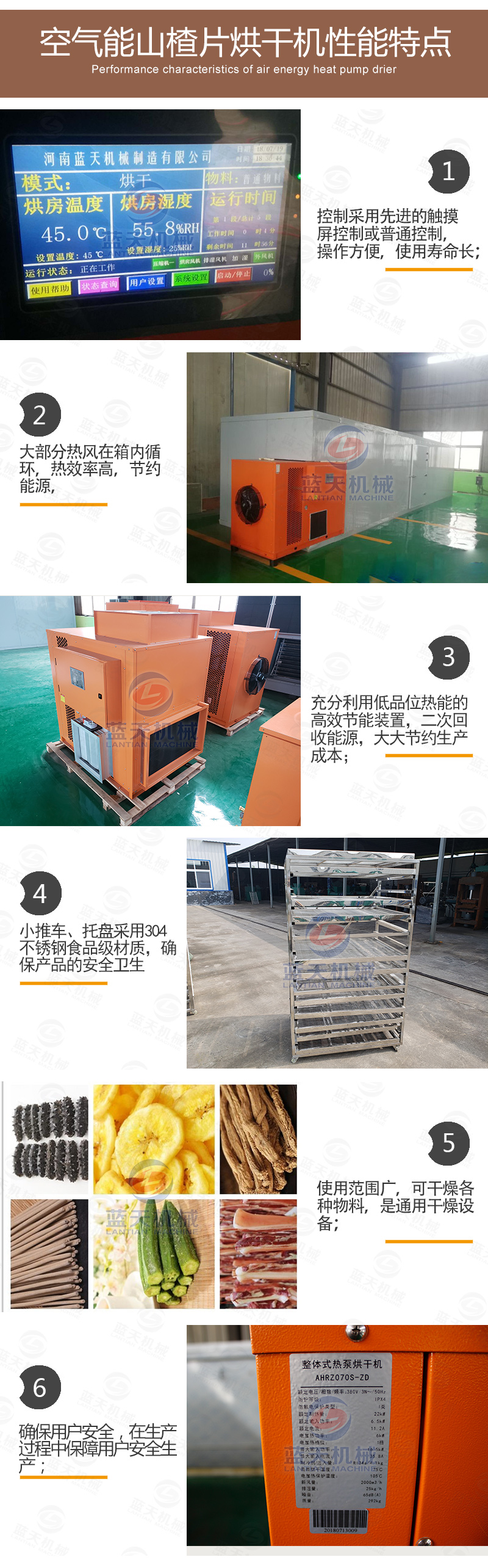 新鮮山楂片的含水率約為80%,烘干的目標含水率約為13%,使用空氣能熱泵小型山楂片烘干機,將智能溫度設定為55度左右的范圍,使山楂片所含的游離水大量蒸發,熱風循環系統不斷輸送新風,將風量均勻的輸送到各層架,排風,促使蒸發的水份通過凝結水管路系統排出。