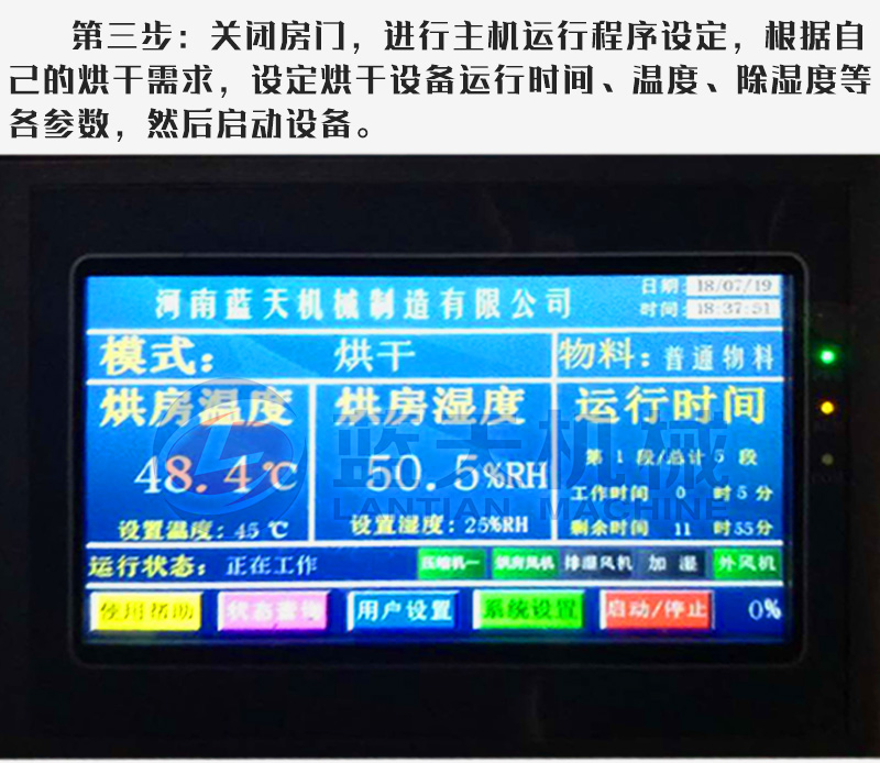 三:將盛放好豆角的物料車推入豆角烘干機設備內(nèi),關閉房門,進行主機運行程序設定,根據(jù)自己的烘干需求,設定烘干設備運行時間、溫度、除濕度等各參數(shù),然后啟動設備。